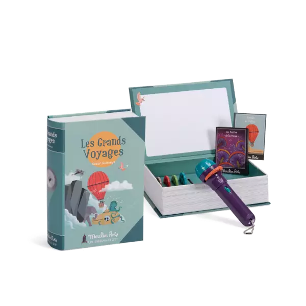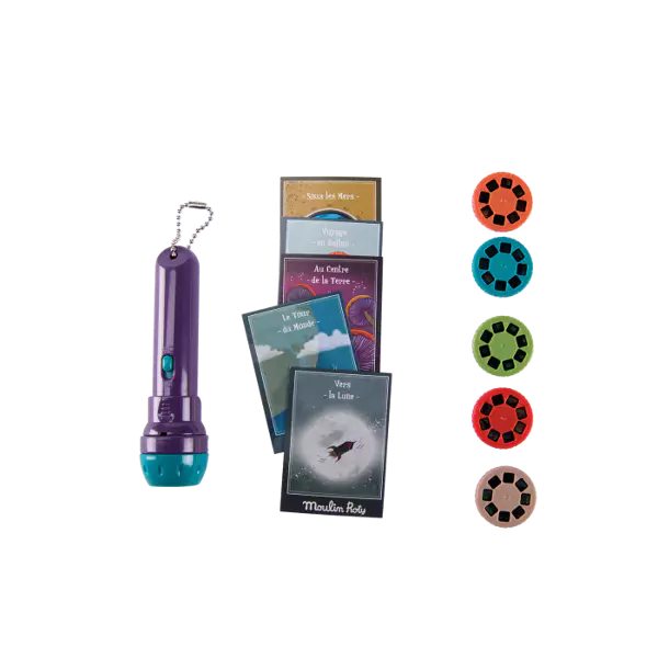 Piletta in plastica con dischetti intercambiabili con le favole da raccontare per accompagnare la nanna del bimbo. 5 storie da raccontare con fantasia in 8 immagini da scorrere. Il bambino sarà catturato dalle immagini e dalla voce del genitore che accanto a lui racconterà una favola magica. Le storie si possono proiettare a parete grazie alla piletta con fuoco regolabile o nello schermo contenuto all'interno del libro/scatola. Batterie a pastiglia incluse. Nella scatola 5 piccole cartoline illustrate. Storie dei grandi viaggi, parti all'avventura raccontando di luoghi inesplorati e misteriose creature. DIMENSIONE SCATOLA: 17x12xh5cm
