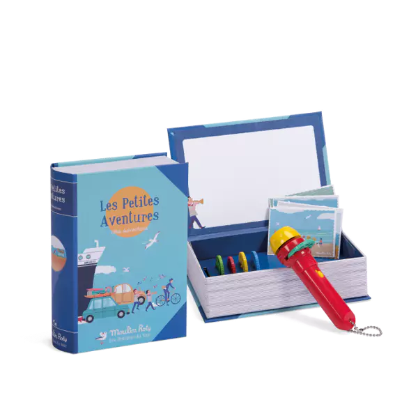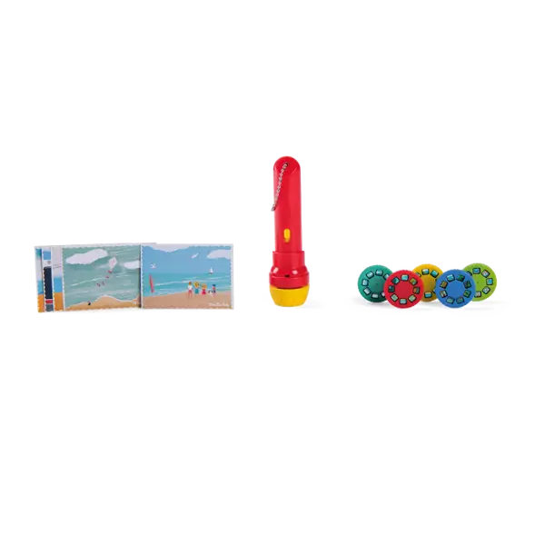 Piletta in plastica con dischetti intercambiabili con le favole da raccontare per accompagnare la nanna del bimbo. 5 storie da raccontare con fantasia in 8 immagini da scorrere. Il bambino sarà catturato dalle immagini e dalla voce del genitore che accanto a lui racconterà una favola magica. Le storie si possono proiettare a parete grazie alla piletta con fuoco regolabile o nello schermo contenuto all'interno del libro/scatola. Batterie a pastiglia incluse. Nella scatola 5 piccole cartoline illustrate. Storie di piccole avventure,viaggi in auto o in bicicletta, al mare o in montagna, passando per paesi in festa. DIMENSIONE SCATOLA: 17x12xh5cm