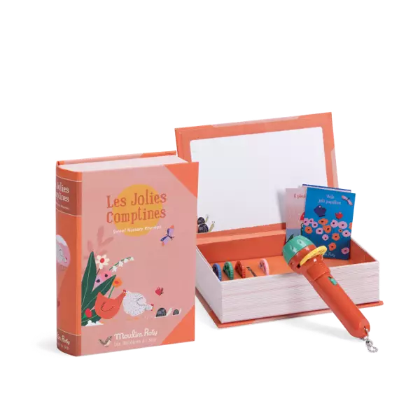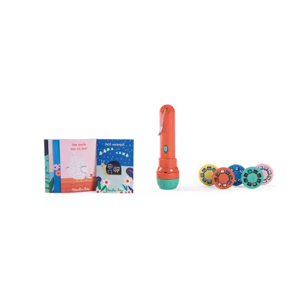 Piletta in plastica con dischetti intercambiabili con le favole da raccontare per accompagnare la nanna del bimbo. 5 storie da raccontare con fantasia in 8 immagini da scorrere. Il bambino sarà catturato dalle immagini e dalla voce del genitore che accanto a lui racconterà una favola magica. Le storie si possono proiettare a parete grazie alla piletta con fuoco regolabile o nello schermo contenuto all'interno del libro/scatola. Batterie a pastiglia incluse. Nella scatola 5 piccole cartoline illustrate. Inventa delle storie con cantilene gioiose di animali felici. DIMENSIONE SCATOLA: 17x12xh5cm