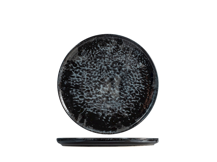 Piatto in porcellana, colore nero, bordo basso, finitura lucida con riflessi luminosi molto gradevoli, piatto con diametro 20 cm solitamente utilizzato come piatto per dolce o frutta o presentazione di antipasti, lavabile in lavastoviglie ed utilizzabile in microonde.