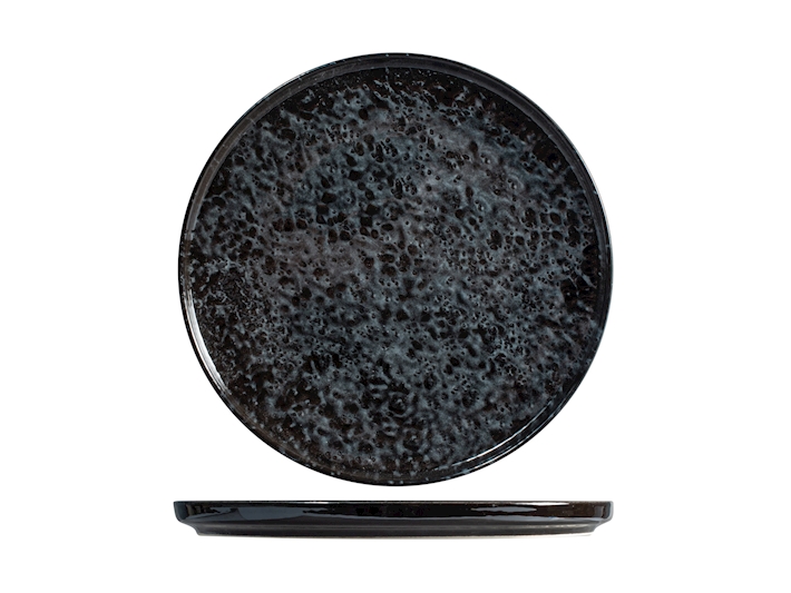 Piatto in porcellana, colore nero, bordo basso, finitura lucida con riflessi luminosi molto gradevoli, piatto con diametro 24 cm solitamente utilizzato come piatto per i primi e secondi piatti o presentazione di antipasti, lavabile in lavastoviglie ed utilizzabile in microonde.
