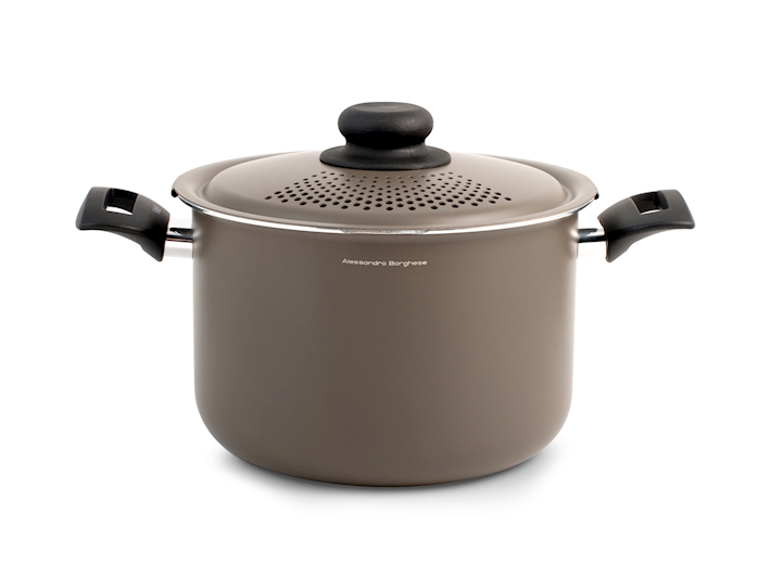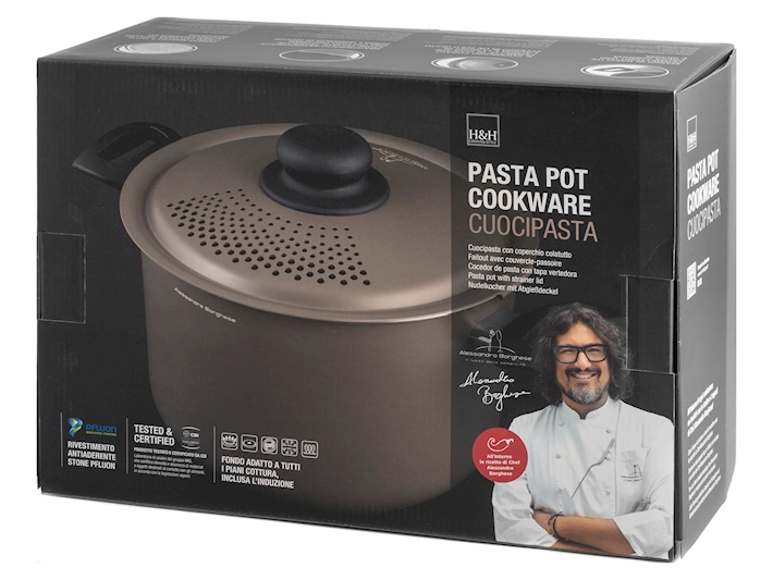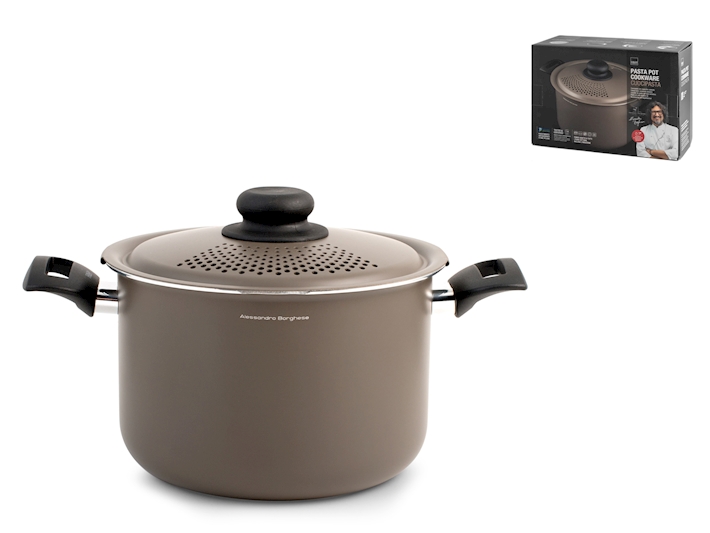 Pentola cuocipasta con coperchio colatutto, diametro 22 cm, corpo in alluminio con rivestimento antiaderente stone pfluon, fondo adatto a tutti i piani cottura, inclusa l'induzione. All'interno le ricette di Chef Alessandro Borghese. Per una maggior durata del rivestimento si sconsiglia il lavaggio in lavastoviglie. DIMENSIONI: D24 H15 (escluso il coperchio)