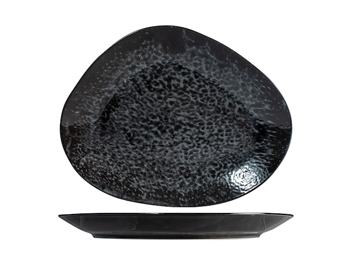 Piatto in porcellana, colore nero, forma irregolare, finitura lucida con riflessi luminosi molto gradevoli, solitamente utilizzato come piatto per dolce o frutta o presentazione di antipasti, lavabile in lavastoviglie ed utilizzabile in microonde. DIMENSIONI: 31X24