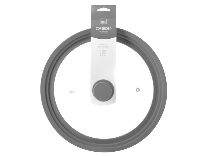 Coperchio in vetro trasparente e sfiato vapore con bordo multimisura in silicone morbido, adatto a tre diversi diametri, 20/22/24cm. Lavabile in lavastoviglie. Non utilizzabile in forno. DIMENSIONI: D25,5 H5