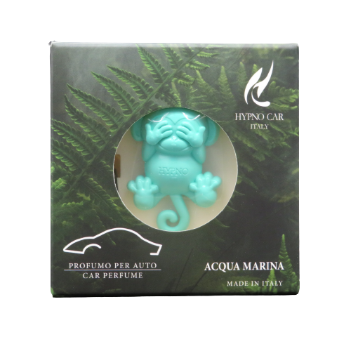 Profumatore per auto monouso Little monkeys, scimmietta sorridente 'non vedo', colore turchese chiaro e profumazione Acqua marina. Applicazione con pinzetta direttamente nelle fessure della ventilazione dell'auto. Durata approssimativa 2 mesi. DIMENSIONI:3,5x5,5