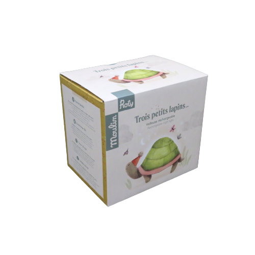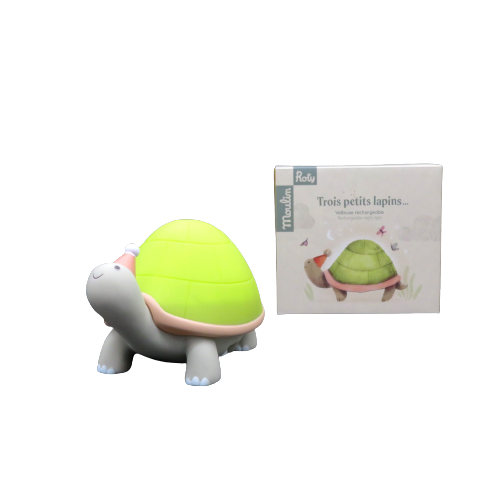 Luce notturna Tartaruga della linea Trois petits lapins, luce ricaricabile in 3 ore con cavetto usb (incluso), luce calda e tranquillizzante posta sulla corazza verde della tartaruga con durata approssimativa di 15 ore; premendo l'apposito tastino sul fondo si può attivare la modalità timer con spegnimento della luce dopo 30 minuti. DIMENSIONI: 13,5X9X8,5CM