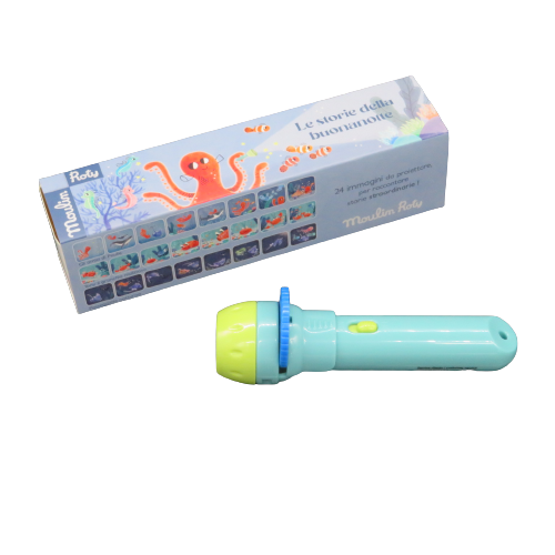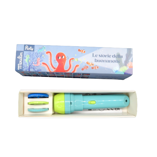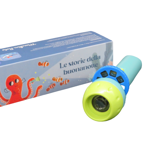 Le storie della buonanotte, immagina il papa o la mamma seduti con il looro piccolo sul lettino metre con la piletta magica proiettano nel soffito o nella parete, nel buio della notte, le storie del piccolo polipo che trasportato dalle correnti del mare e degli oceani esplora nuovi orrizzonti marini e conosce nuovi amici. 24 immagini si susseguono e aspettano solo di essere raccontate dal genitore che accompagna il bambino nei sogni più fantasiosi.