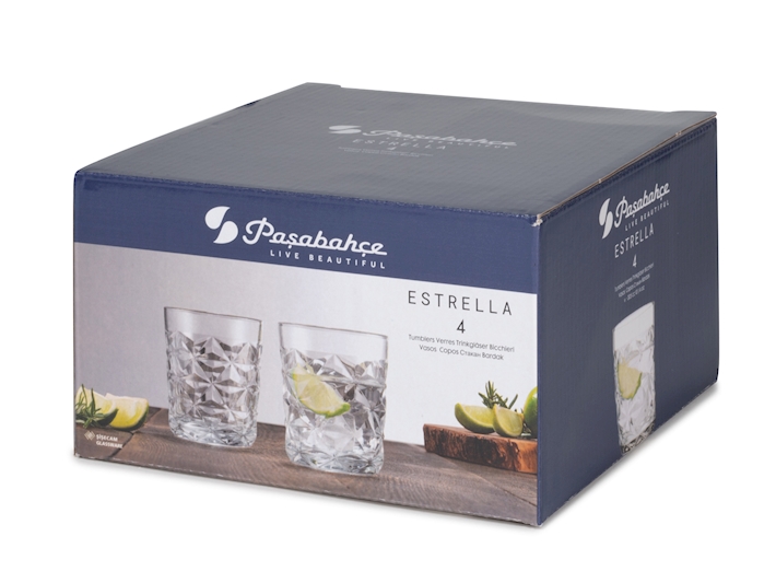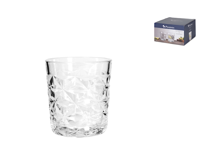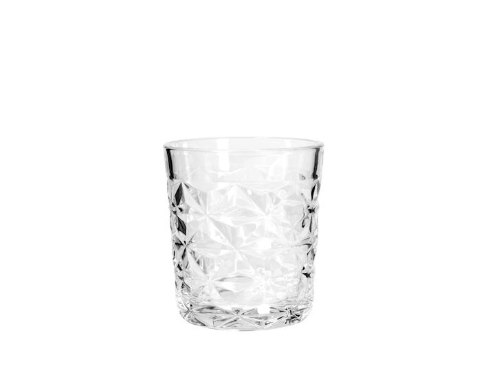 bicchiere tumblers in vetro capacità 305cc modello Estrella di Pasabahce, esterno sfacettato, bordo grosso e vetro pesante, ideali per coctail/aperitivi con ghiaccio ma anche come bicchiere da tavola.