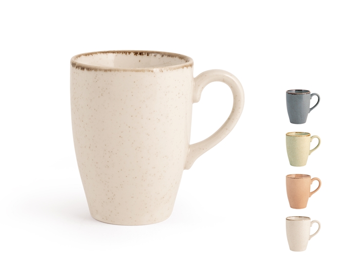 Tazza in porcellana di H&H modello Pearl colori assortiti, effetto puntinato, bordo marroncino. 240ml . Adatta all'utilizzo in microonde. Per lavastoviglie. DIMENSIONI: 7,5 h10 cm